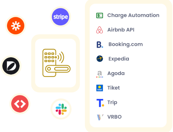 Illustration showing AdvanceCM integrations with booking channels, smart devices, and software APIs, including icons representing platforms like Agoda, Airbnb API, Booking.com, and smart locks, webready and slack.