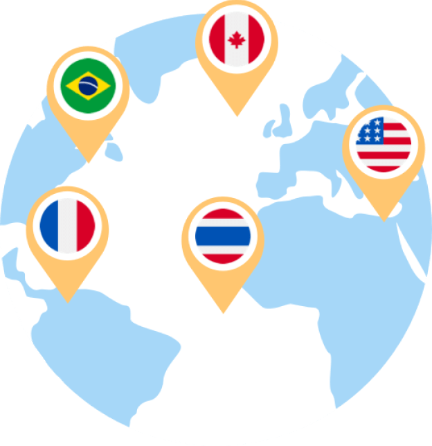 Illustration of a world map with location pins featuring flags from Brazil, Canada, the United States, France, and Thailand, representing localized support for property management.
