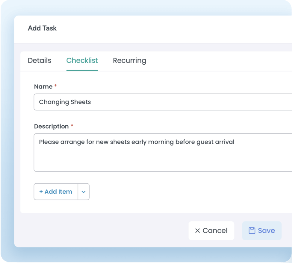 Create custom checklists for each task to ensure all required steps are completed before marking a task as done. For example, a cleaning task could include a checklist with items like changing sheets, mopping the floor, and restocking toiletries. This feature helps maintain consistency and quality across your team.
