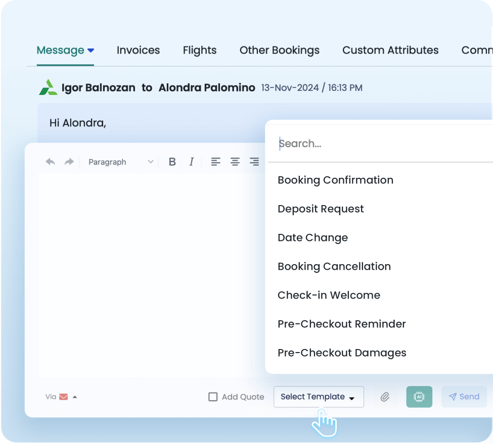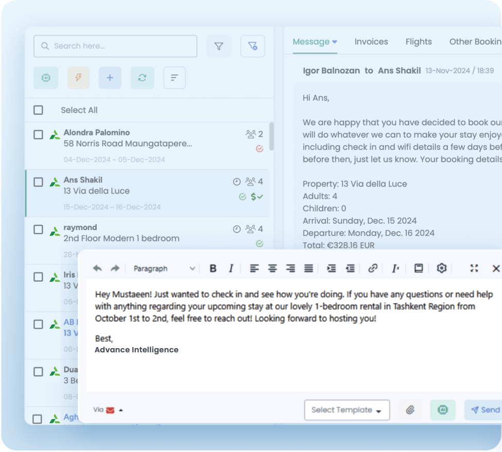 Create custom message templates for common communications like welcome messages, booking confirmations, and check-out instructions. Schedule them to be sent automatically.